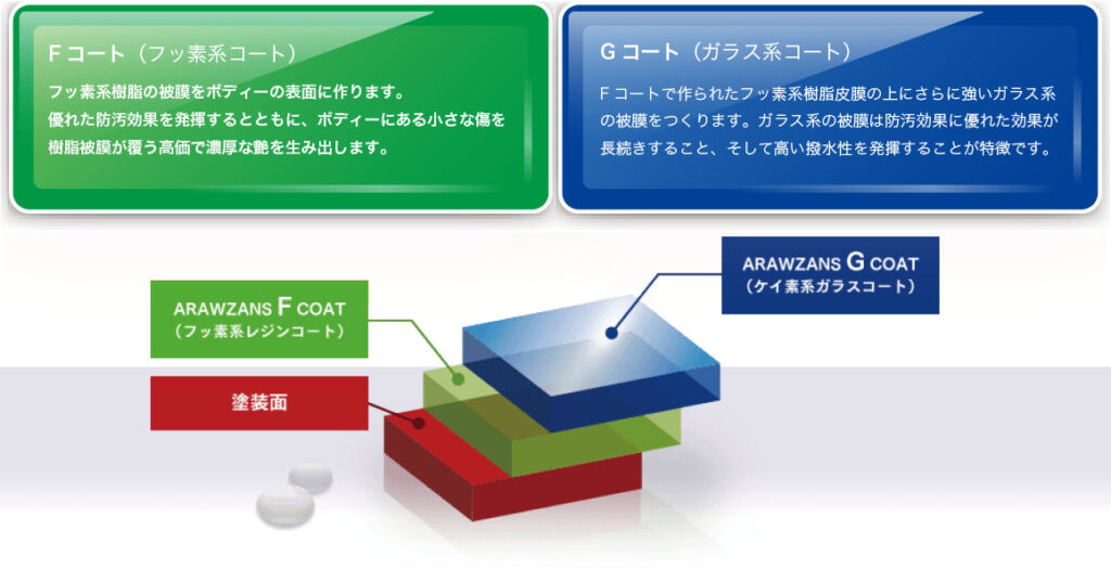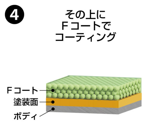 ARAWZANS 90のトップコートに使用するFコートは、シリコーン系樹脂とフッ素系樹脂をハイブリットに組み合わせた新開発のコート剤です。