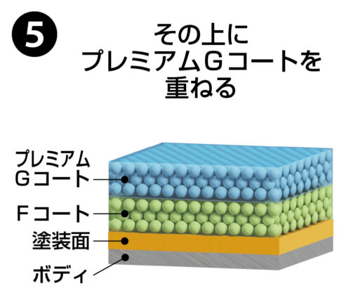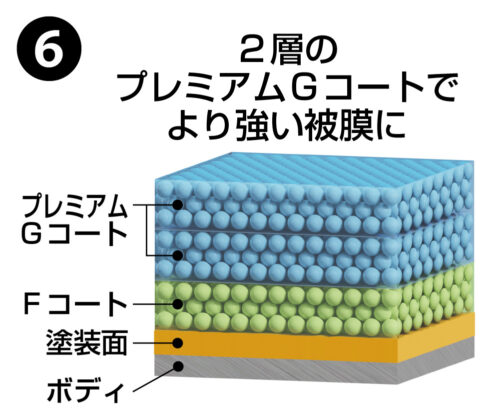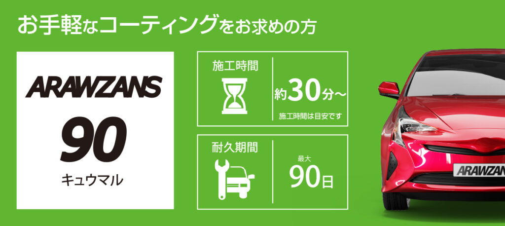 柔軟性の高いARAWZANS 90を土台に、強靭な硬化型ガラスコートのプレミアムGコートをトップコートに重ねる2層構造のガラスコーティング。
